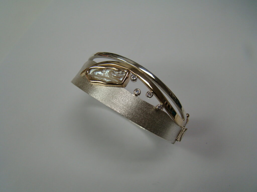 Brushed White Gold Bangle with Mother of Pearl and Bezel Set Diamonds