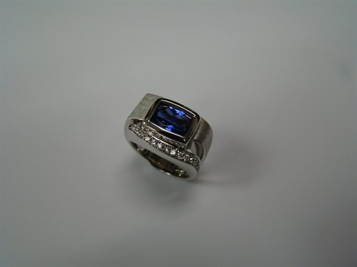 Rectangular Cushion Cut Sapphire Ring in a Brushed White Gold and Channel Set Diamond Setting