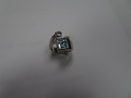 Bezel Set Princess Cut Aquamarine Ring in a White Gold and Pave Diamond Setting with a Bezel Set Round Cut Diamond